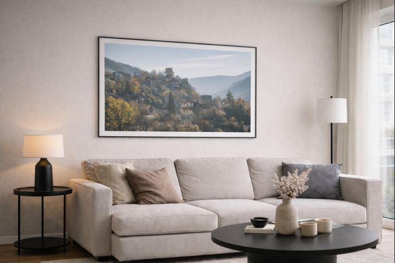 This project showcases a living room adorned with mountain landscape artwork, creating a sense of natural beauty and tranquility. The framed mountain photograph adds a touch of scenic charm to the space.